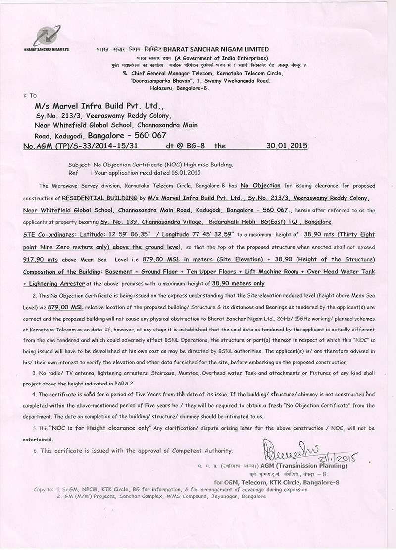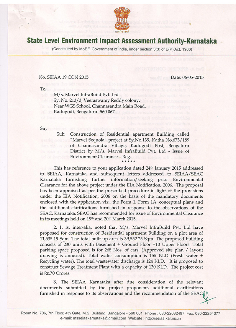 Located at Whitefield the most happening stretch of IT and ITeS hub of Bangalore, Marvel Sequoia is your home, your haven and gateway to the good life. A lavish, contemporary gated community with 230 homes and fabulous amenities. It offers you an unparalleled life of luxury of resort style. Spread across 3 acres of sprawling space; Marvel Sequoia boasts 4 blocks of two magnificent 10 storeys towers offers elegant 2, 2.5 & 3 BHK apartments with choice of approximately 1252> to 1573 sq.ft. of unclosed space apartment. All around landscaped lush green area and water body creates a sense of nature all around. Vehicular movement has been deliberately limited to double basement to provide an unpolluted space at the ground level for people to meet and socialize. Marvel Sequoia strikes a balance of all the benefits of living in a community and the advantages of private homes without common walls.
